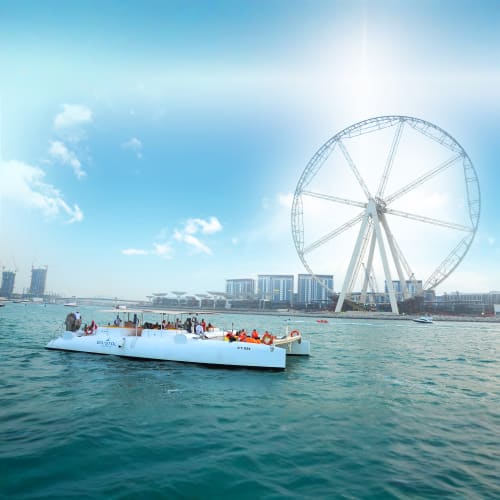 Cruise through Dubai Marina and glide past stunning attractions like Skydive Dubai, Ain Dubai, and Jumeirah Beach Residences. As your yacht gracefully sails across the turquoise waters, you’ll be treated to breathtaking views of The Palm Jumeirah and the majestic Atlantis. For longer trips, extend your route toward the iconic Burj Al Arab, the symbol of Arabian luxury.