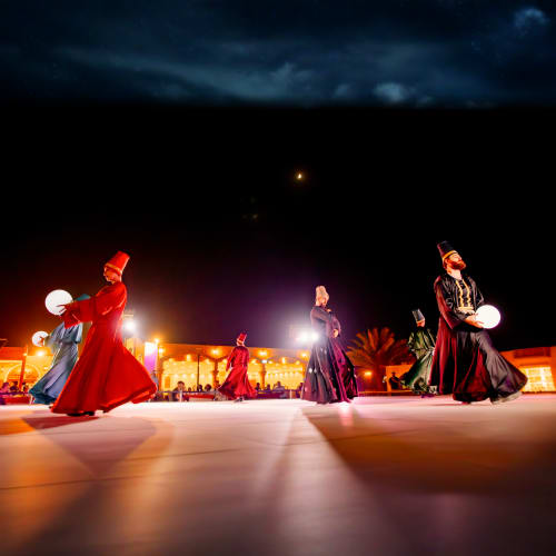 As twilight deepens, indulge in a lavish BBQ buffet featuring both vegetarian and non-vegetarian delights. Let the rhythm of live performances enchant you — from the elegance of belly dancing to the mesmerizing spins of the Tanoura show. Surrounded by the cool desert breeze and glowing lanterns, the atmosphere captures the very soul of Arabia.