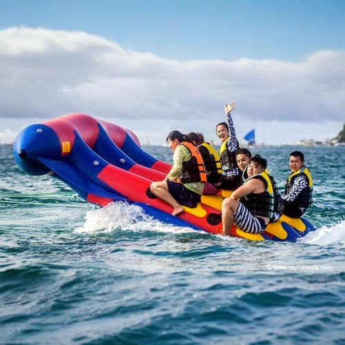 Prepare to take your water adventure to new heights with Arabian Royal’s Fly Fish Ride in Dubai — a thrilling twist on the classic banana boat experience. Hold on tight as you board an E-shaped inflatable raft, securely fastened and ready to be towed across the shimmering Arabian Gulf by a high-powered waverunner. Within seconds, you’ll find yourself flying, bouncing, and gliding above the waves — laughing, screaming, and soaking in the pure thrill of it all.